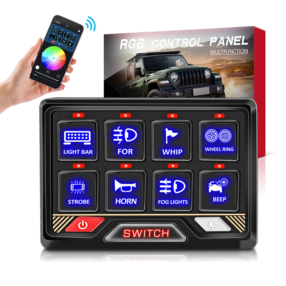 High Quality 8 Gang APP Control Switch Panel with Flashing RGB Indicator for 4x4/Offroad Car LED Accessories 12V Circuit Control